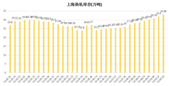 本周上海热卷库存持续上量,据我网统计,当前上海热轧市场主要仓库总库存为32.98万吨,较上周升高1.08万吨。