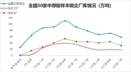 分区域来看,华北市场一枝独秀,表现相对较好,在库存继续下降的支撑下,价格坚挺。华南市场而言,中板社库亦处下降态势,且出货一般,因此价格跌幅较华北相同在30元左右。而华东市场表现则不尽人意,一方面期货拉涨乏力,另一方面主导钢厂价格下调,加之商家心态及出货不佳,使得中板价格快速下滑100元左右。